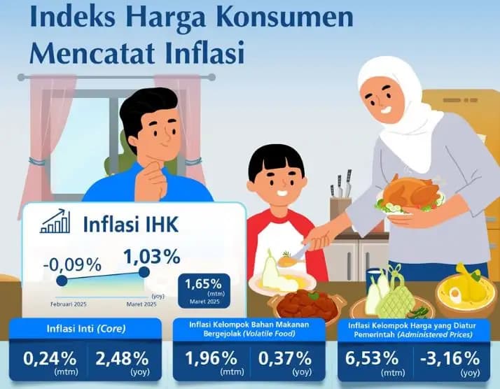 Indeks Harga Konsumen (IHK) pada Maret 2025 mengalami inflasi dibandingkan bulan sebelumnya. Berdasarkan data Badan Pusat Statistik, IHK Maret 2025 tercatat inflasi sebesar 1,65% (mtm), sehingga secara tahunan IHK mengalami inflasi sebesar 1,03% (yoy). Bank Indonesia akan tetap konsisten menjaga stabilitas harga dan mempererat sinergi pengendalian inflasi dengan Pemerintah (Pusat dan Daerah) dalam Tim Pengendalian Inflasi Pusat dan Daerah (TPIP dan TPID) melalui Gerakan Nasional Pengendalian Inflasi Pangan (GNPIP) di berbagai daerah. Ke depan, Bank Indonesia meyakini inflasi akan tetap terkendali dalam kisaran sasaran 2,5±1% pada 2025.